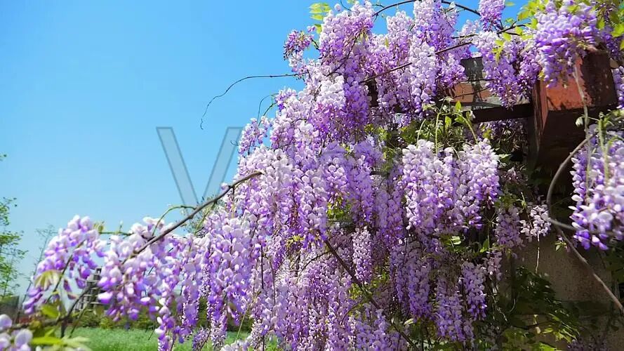 In spring, wisteria flowers and vine flowers hang down in strings, like purple bead curtains, dreamy and mysterious.