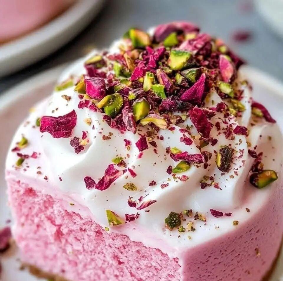 6. * Top and eat: * * Spread the cake with whipped cream and sprinkle with pistachios and rose petals!