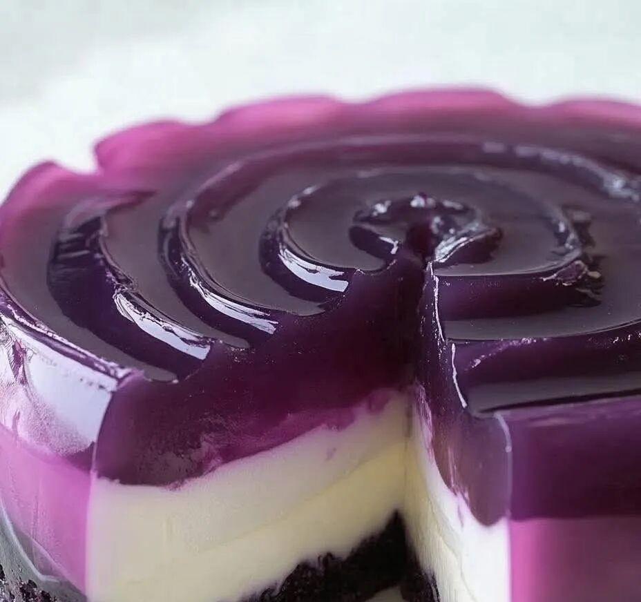 7. Once the cream is solidified, carefully pour the grape jelly over the white cream in the mold.