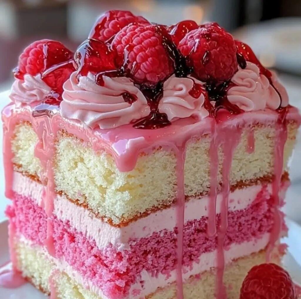 7. When the cake has cooled, place one of the layers on a plate. Spread a generous layer of whipped cream on top and top with half of the fresh raspberries.