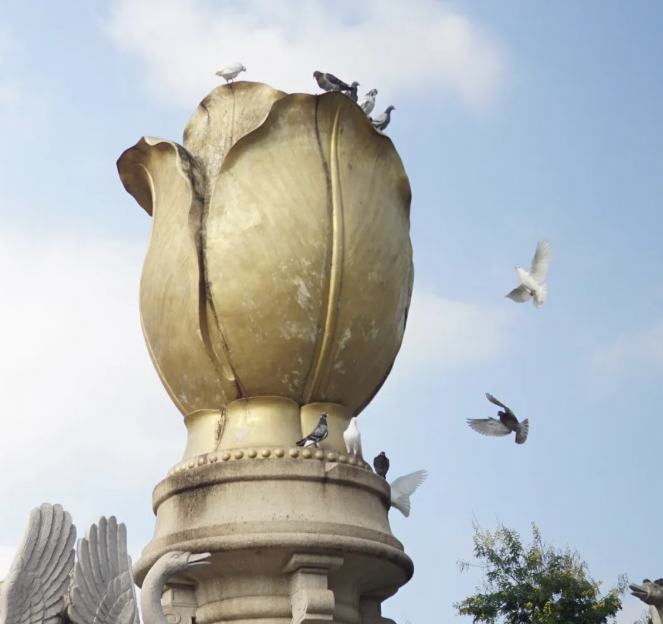 Walk to the square,White pigeons perched on the sculpture, and they paced leisurely, as if the outside noise had nothing to do with them.