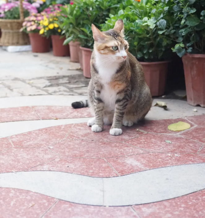 In front of the potted plant, a cat squatted quietly, looking into the distance, as if blending into the surrounding quietness, revealing a kind of free stretch. The surroundings are quiet, and time seems to have slowed down at this moment, leaving onlyThe natural harmony between cats and vegetation.