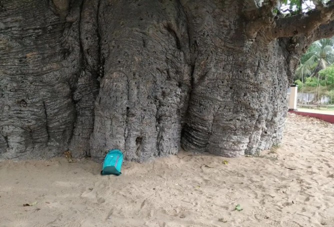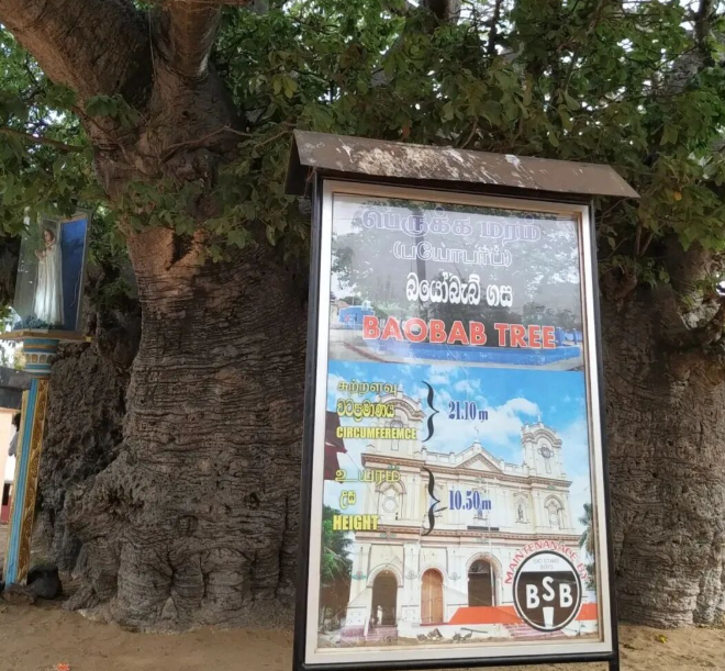 The baobab tree in Mannar is on the side of the road. It is very old, and its trunk is too thick for dozens of people to hold it.
