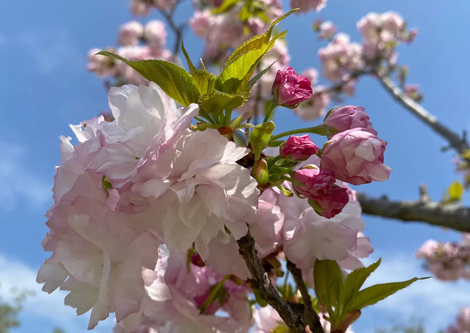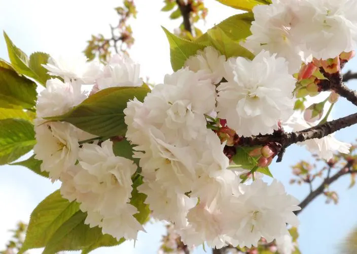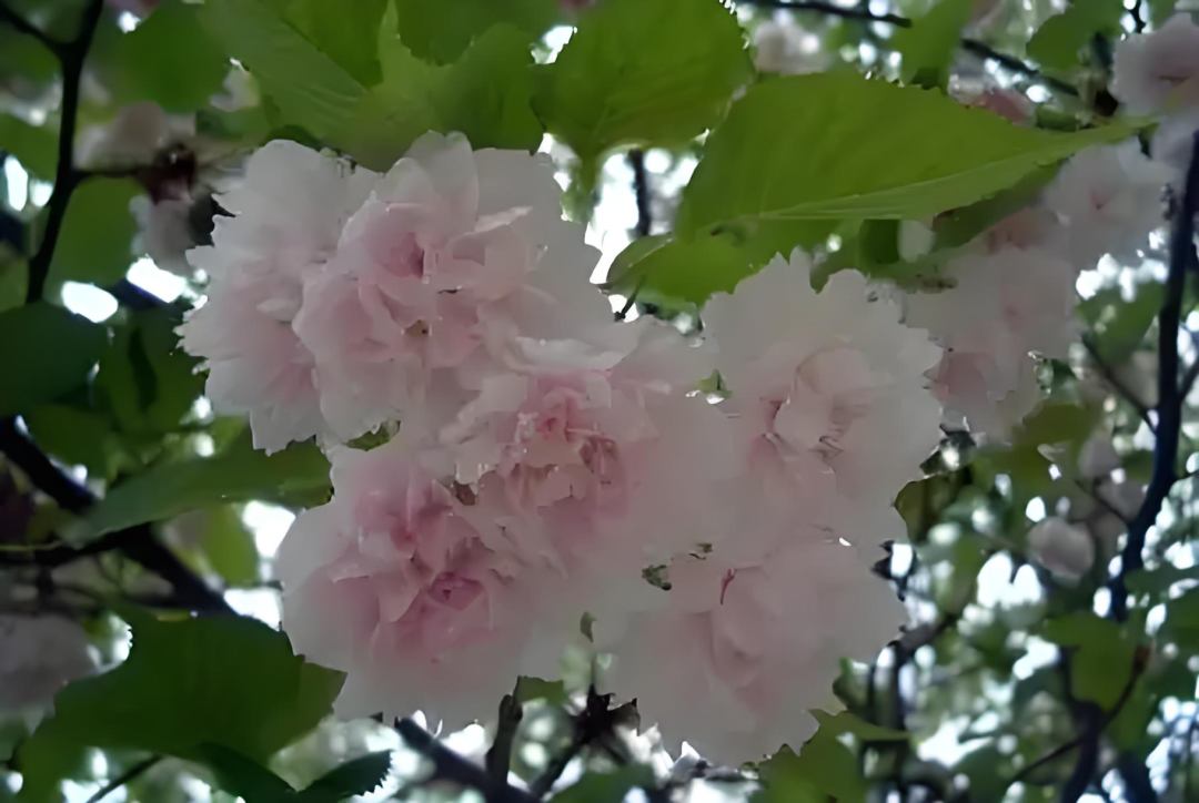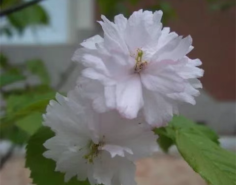 One-leaf cherry blossom is not just one leaf, but It is named because it has a leafy pistil. its Large flowers, large and double flowers (Flower diameter 4.5-5 cm, with 25-30 petals) , the buds are pink, and the flowers are pink-white after blooming ( Pale to white center, lighter pink on edges and outer layer) Flower friends affectionately describe its flowers as white and soft mini clouds hanging on branches. Flowering period mid-March to mid-April