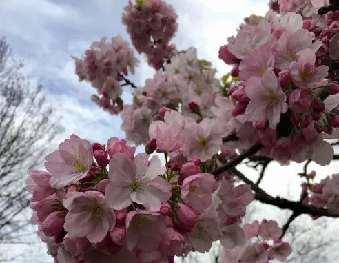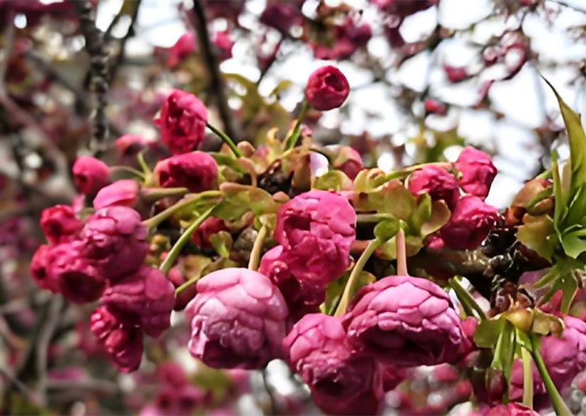 Duck cherry is also a cherry blossom variety with many petals and peculiar, with a flower diameter of 3.4-4.6 cm and 300-480 petals. The outer petals are reddish, the inner petals are purplish, and the central petals are densely knotted, which is very layered and heavy. The pedicel is also long and densely covered with white hair, which looks very distinctive. Flowering period is mid-to-late April.