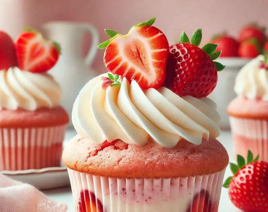Fill the cupcakes with the mixture and decorate with whipped cream and fresh strawberries.