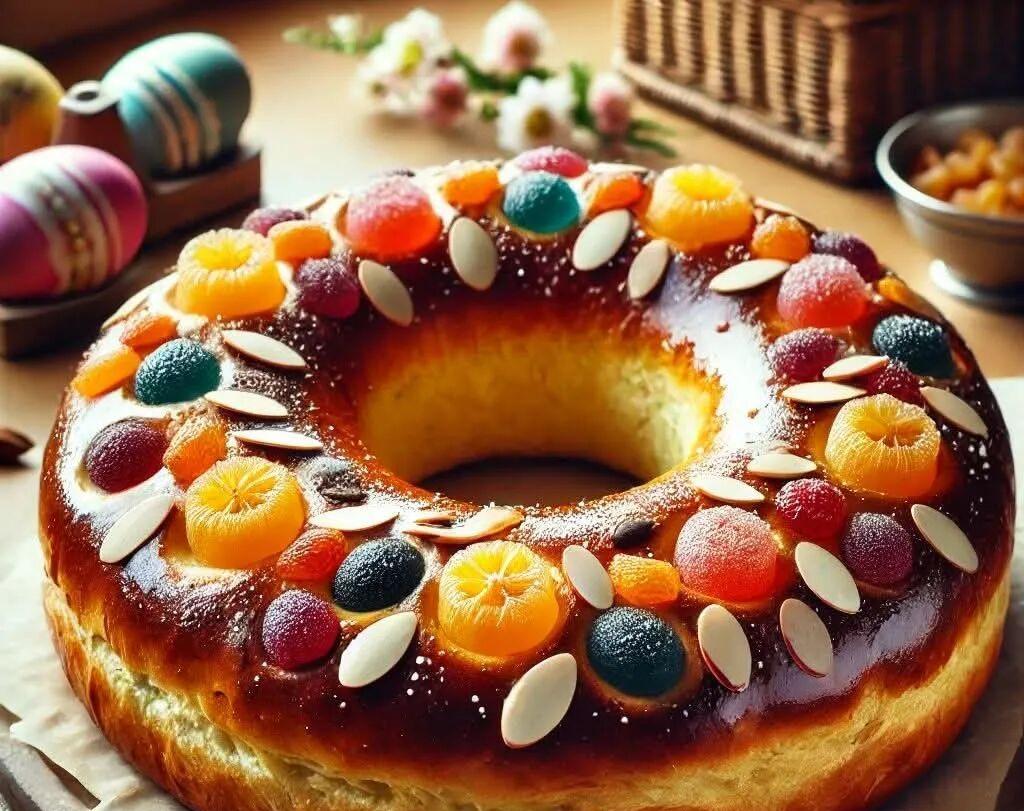 Once the dough is awake, turn it over and roll it out into a rectangle. Sprinkle candied fruit and almonds on top. Roll the dough into a donut shape.