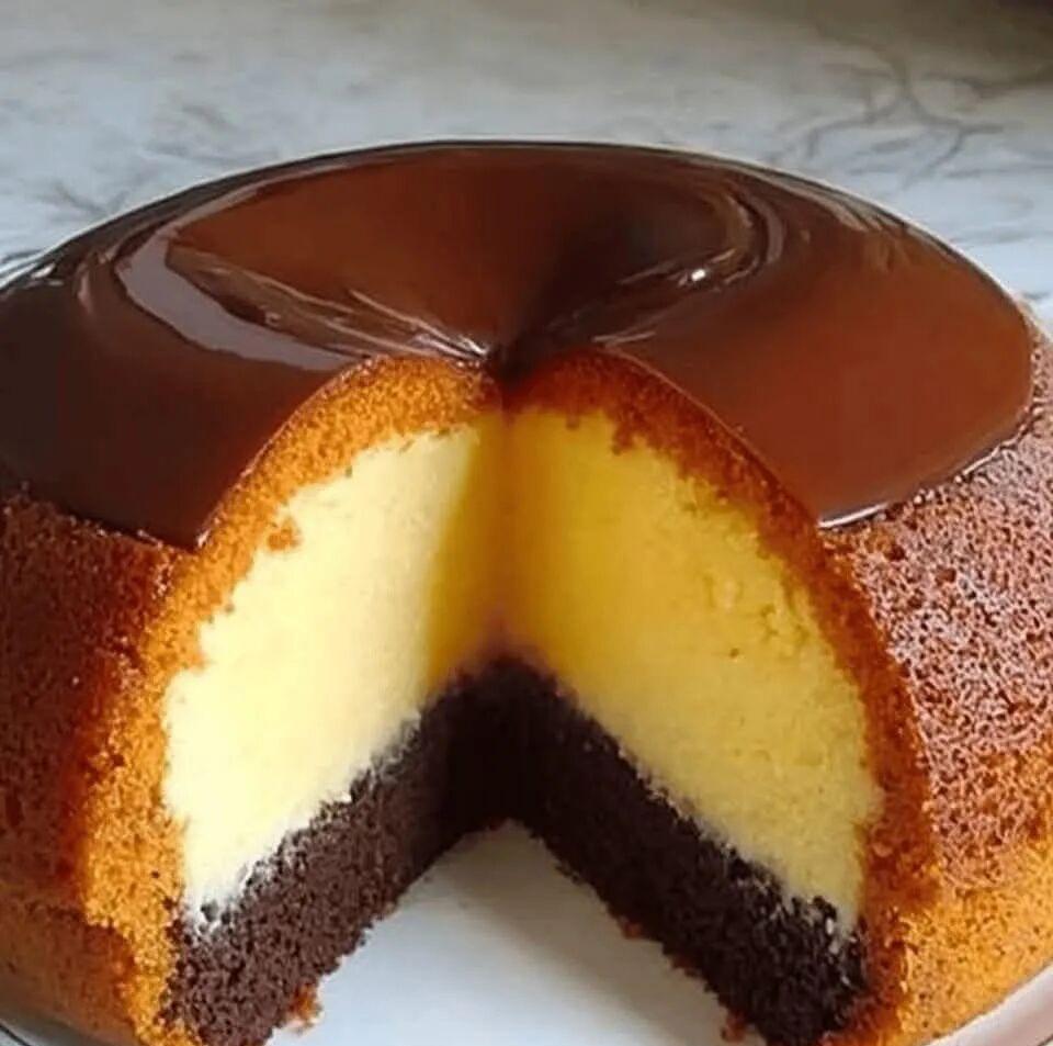 4. * Assemble the chocolate cake: * Pour the cake mixture over the caramel, then gently pour in the custard mixture.