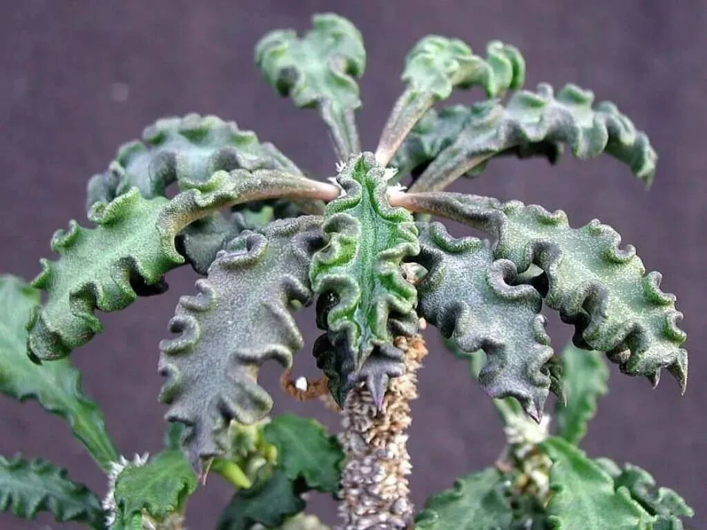 The cyclone unicorn plant is short, with thick fleshy roots, upright or creeping stems, and highly spiral, hence its name.
