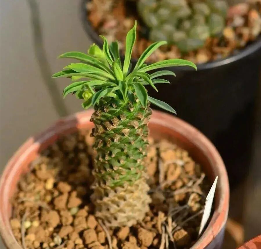Iron-armored unicorn is also called Cycas Euphorbia and Iron-armored Pill. Its stem is cylindrical, usually unbranched. The surface of the stem forms a nodular surface due to the shedding of leaves, which is arranged in a network spiral, shaped like pine cones and pineapples, which often gives people a deep impression.