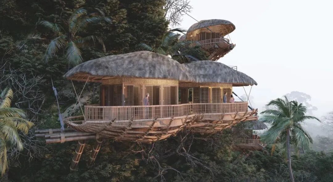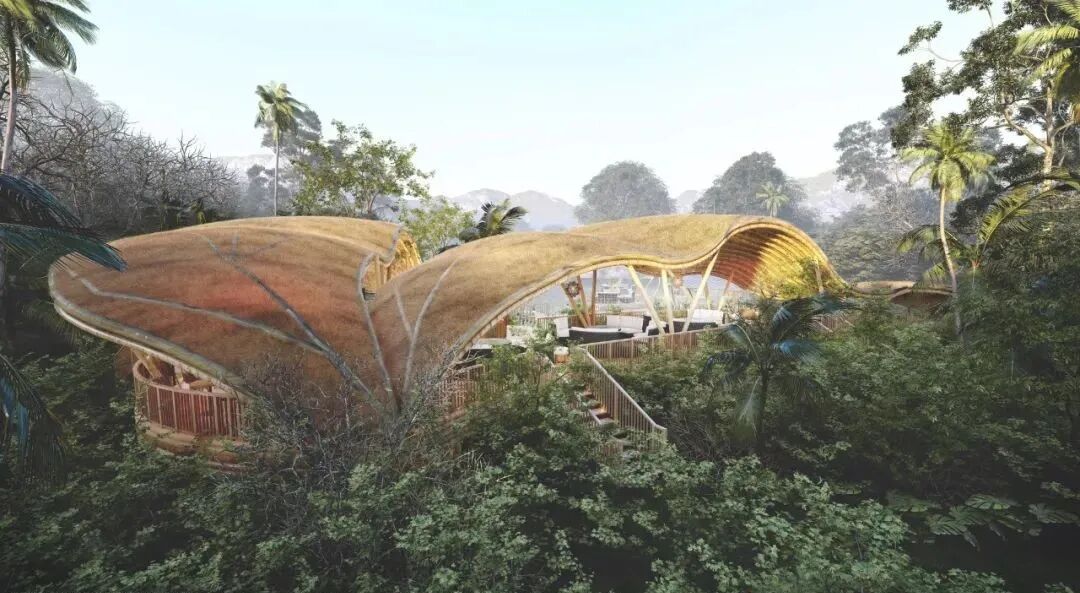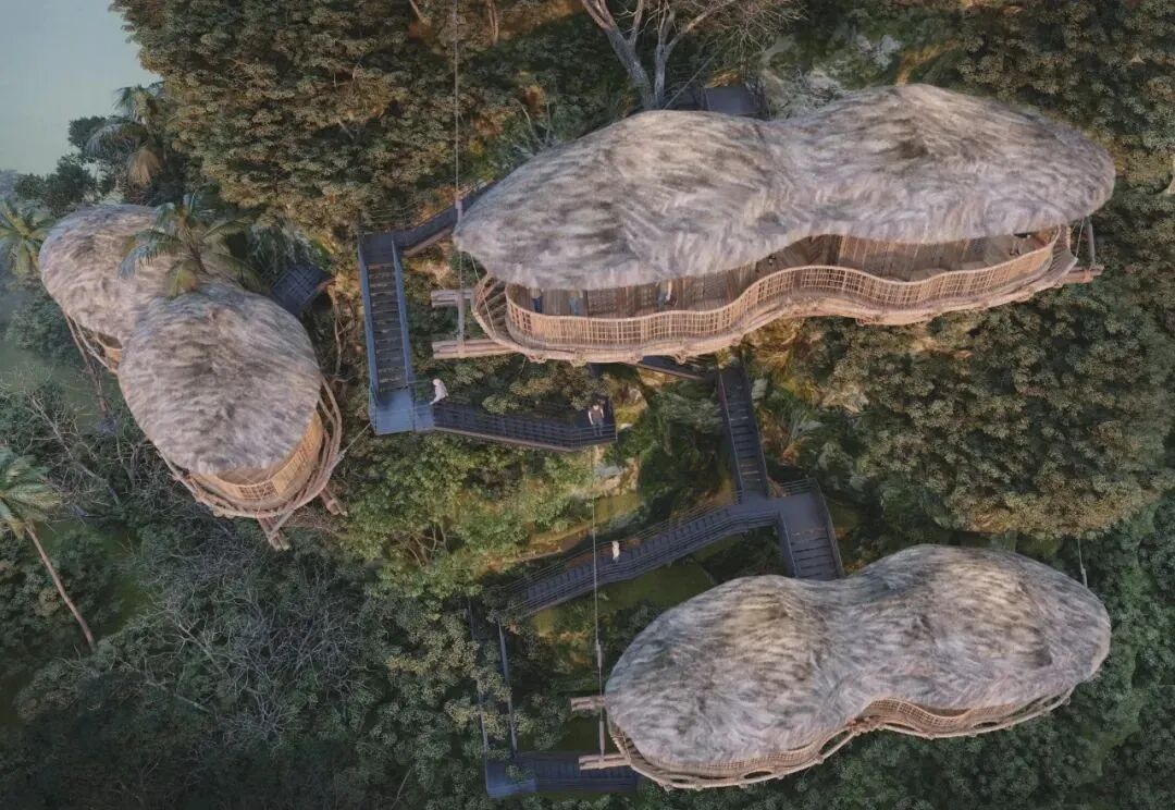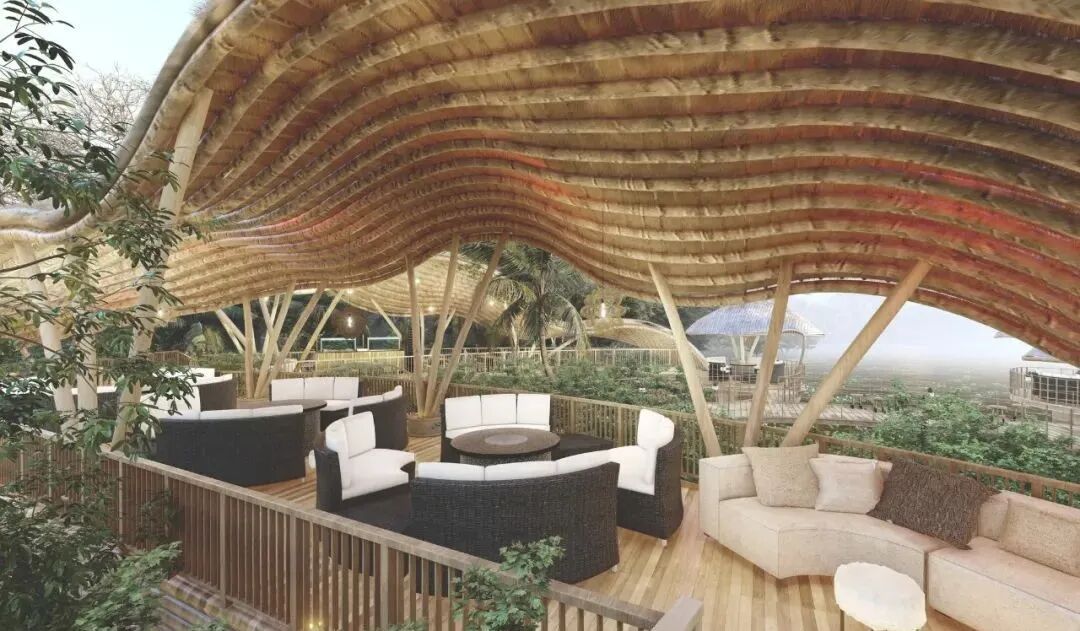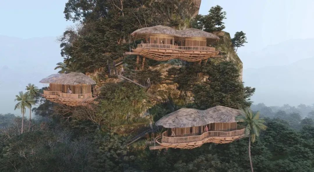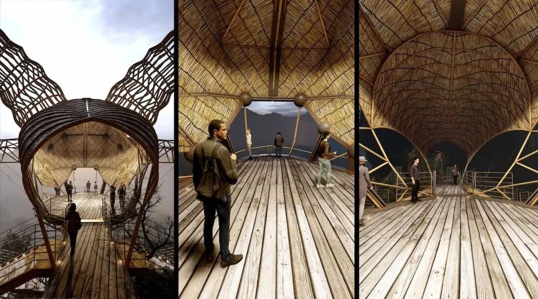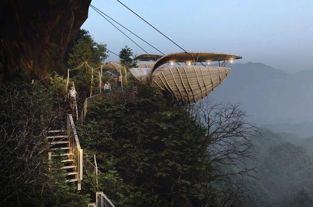 The main materials of the observation deck are natural wood, bamboo and palm leaves. With a lower carbon footprint and enhanced structural strength through two steel cables, these designs are a model of low cost and high safety.
