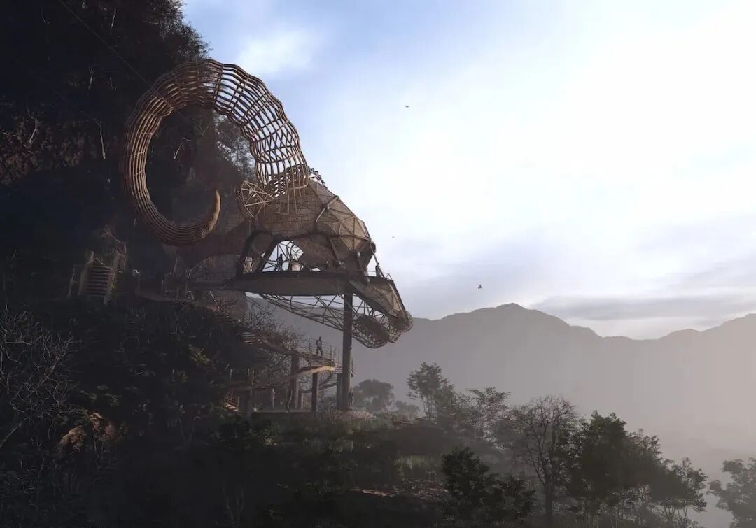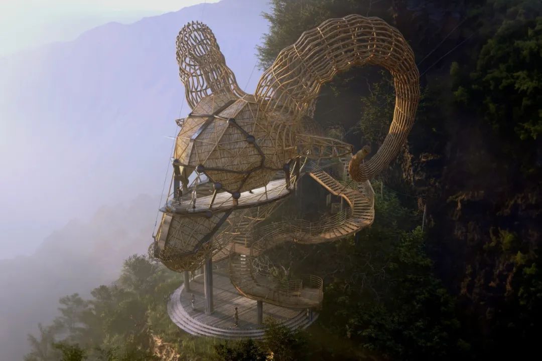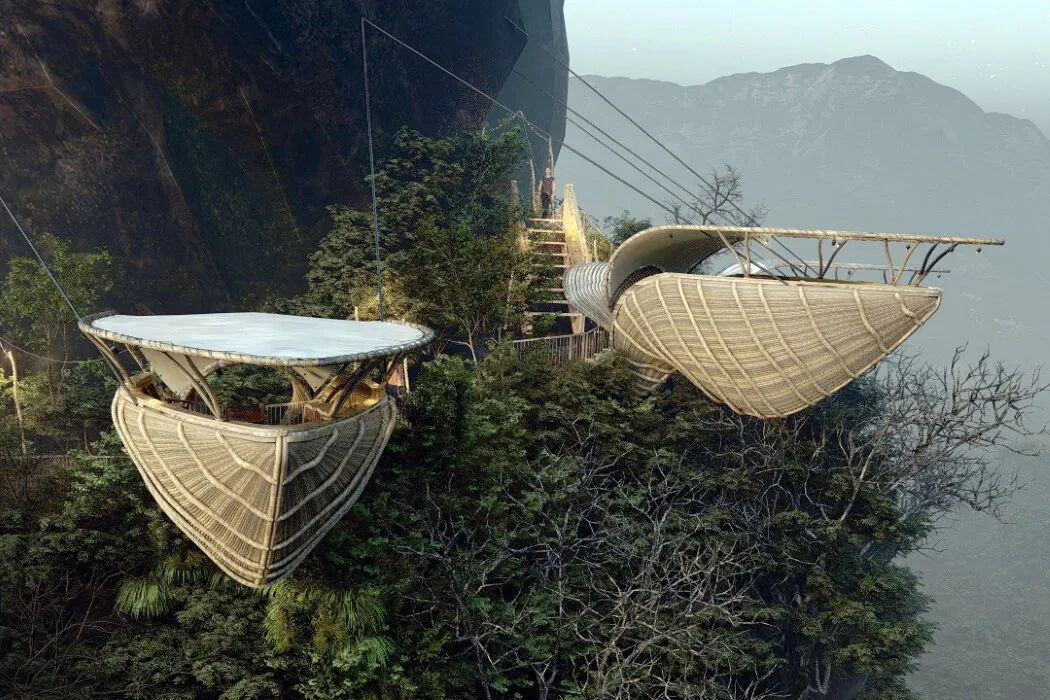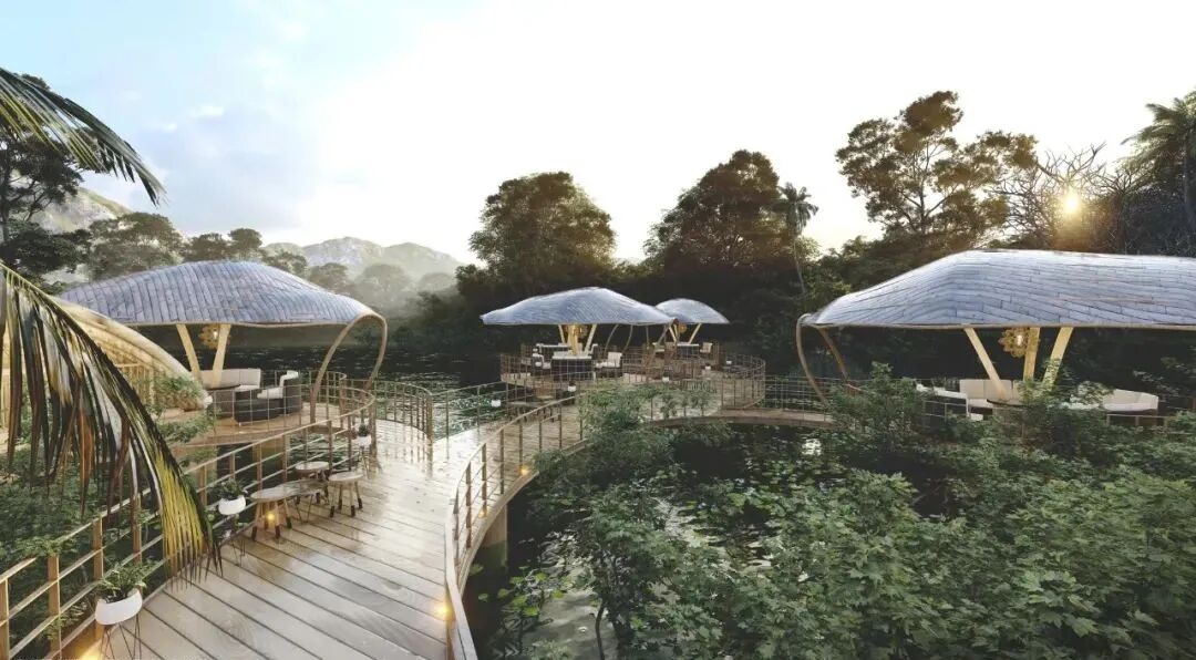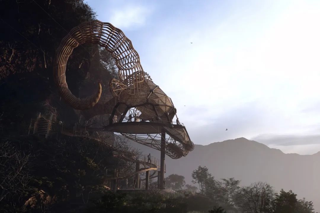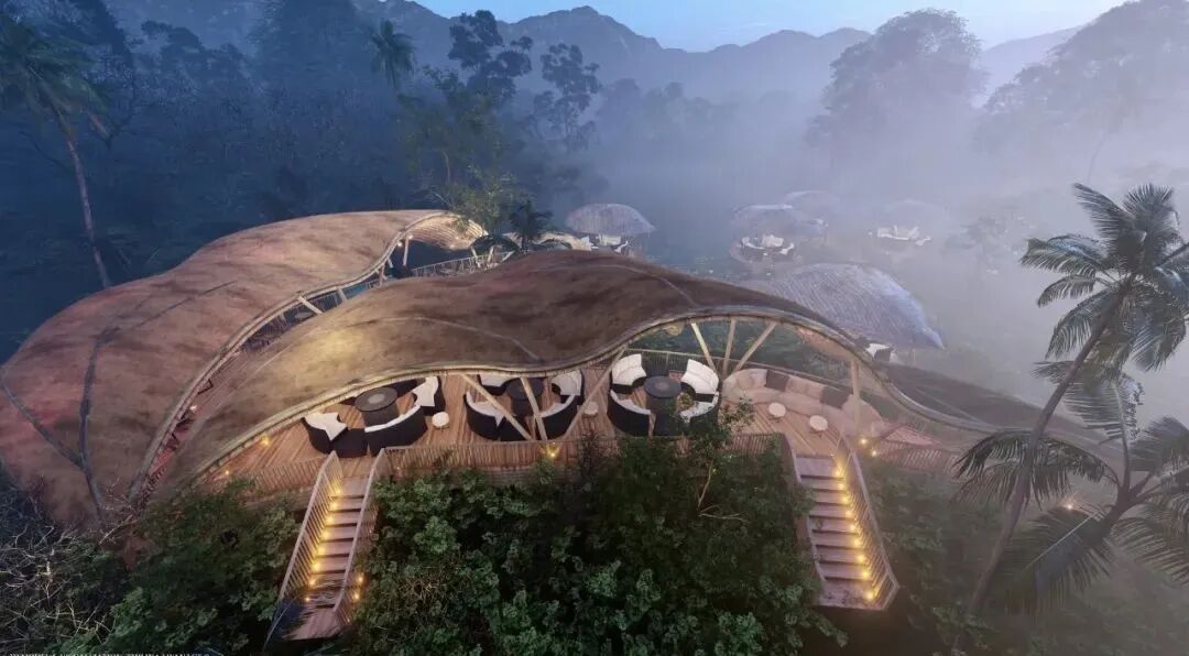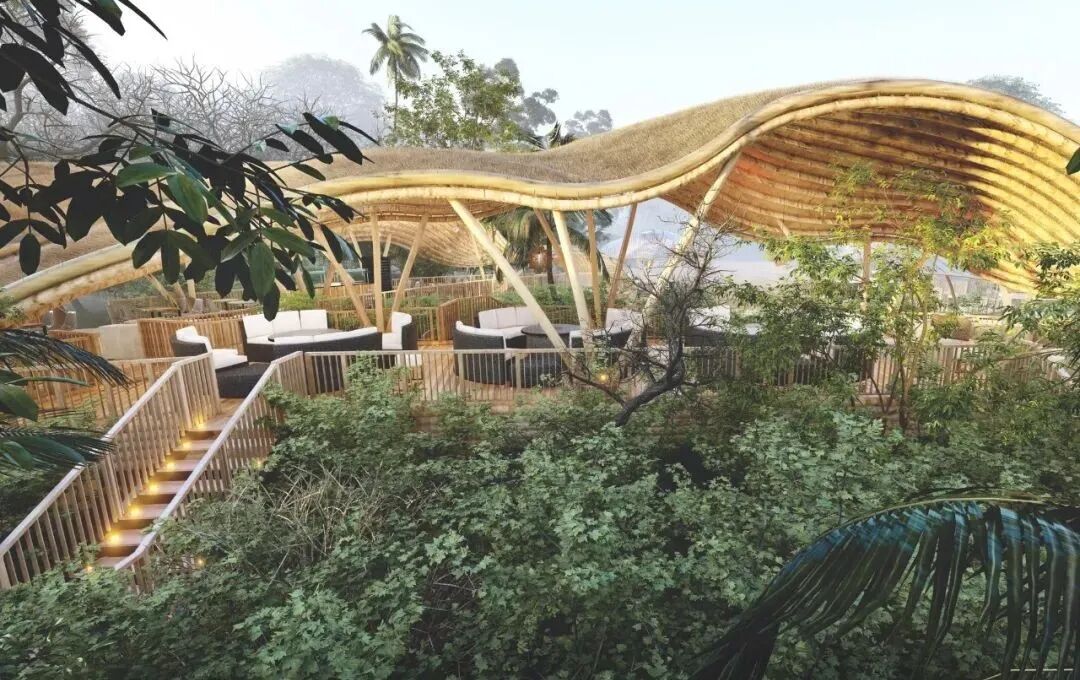 The main materials of the observation deck are natural wood, bamboo and palm leaves. With a lower carbon footprint and enhanced structural strength through two steel cables, these designs are a model of low cost and high safety.