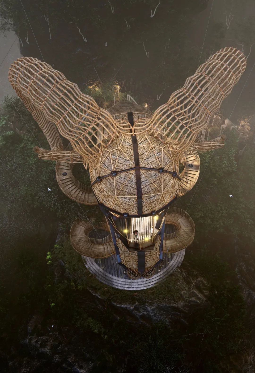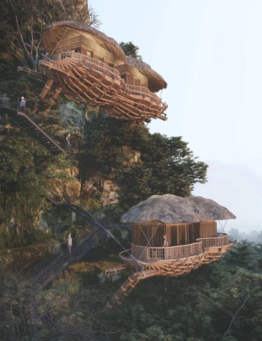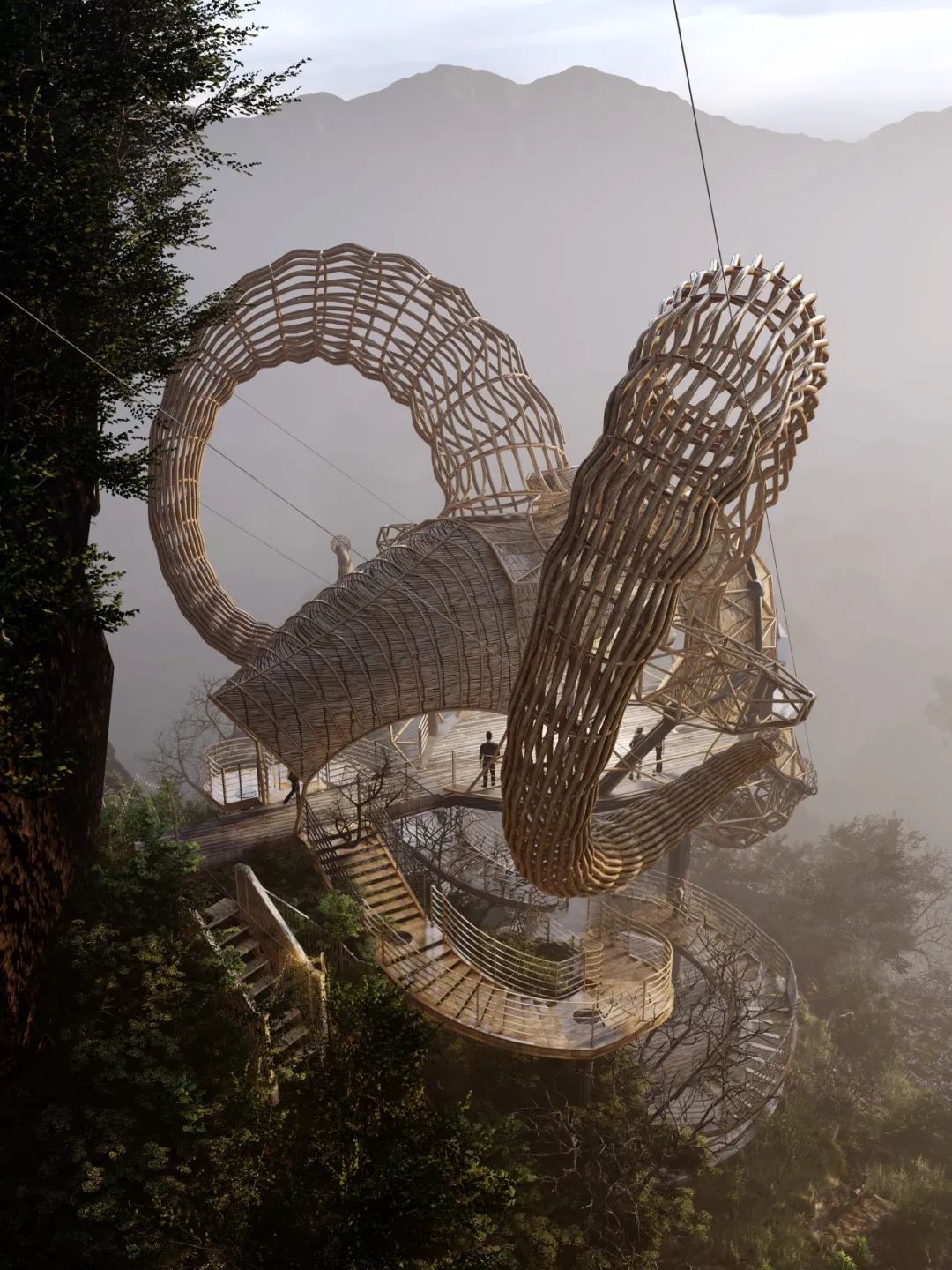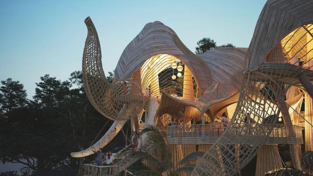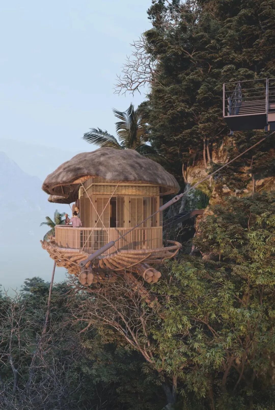 The main materials of the observation deck are natural wood, bamboo and palm leaves. With a lower carbon footprint and enhanced structural strength through two steel cables, these designs are a model of low cost and high safety.