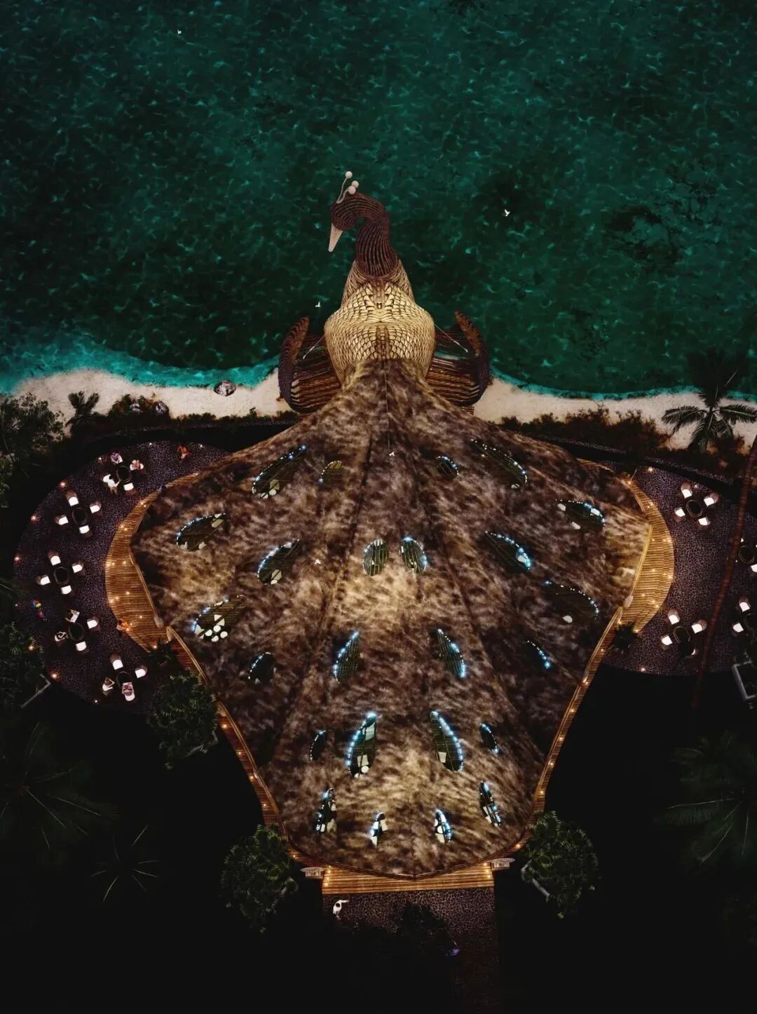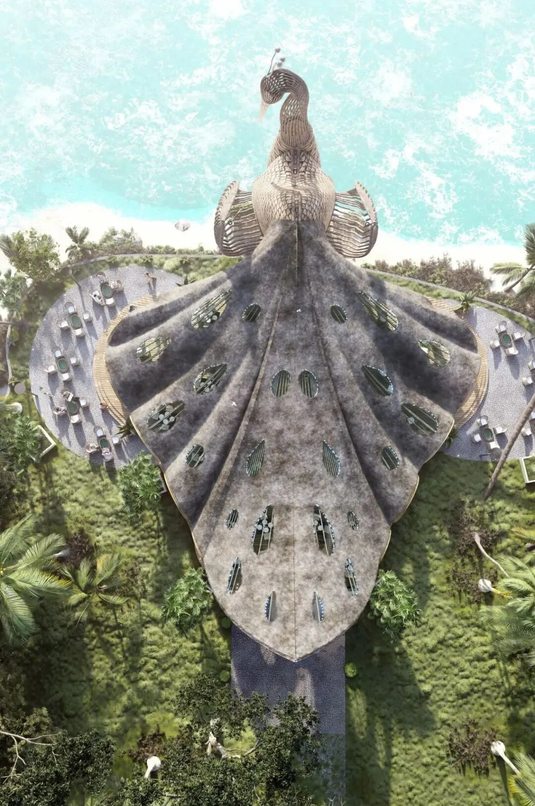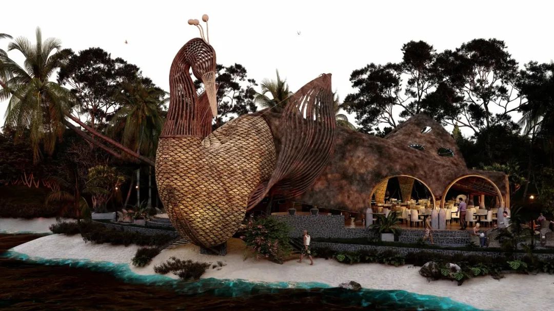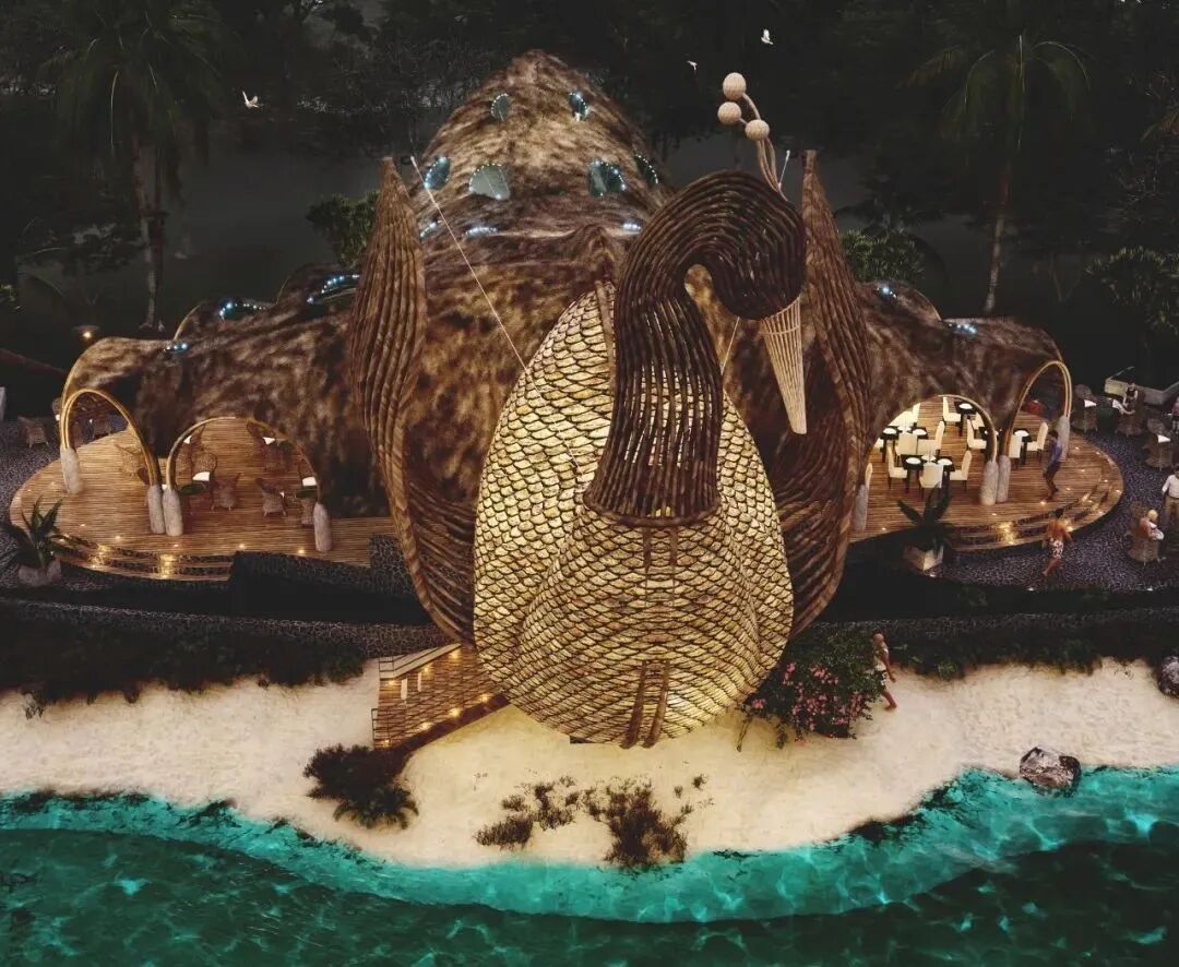 Lyanna wanted to show the magnificence of peacocks and designed this beach restaurant in its shape.