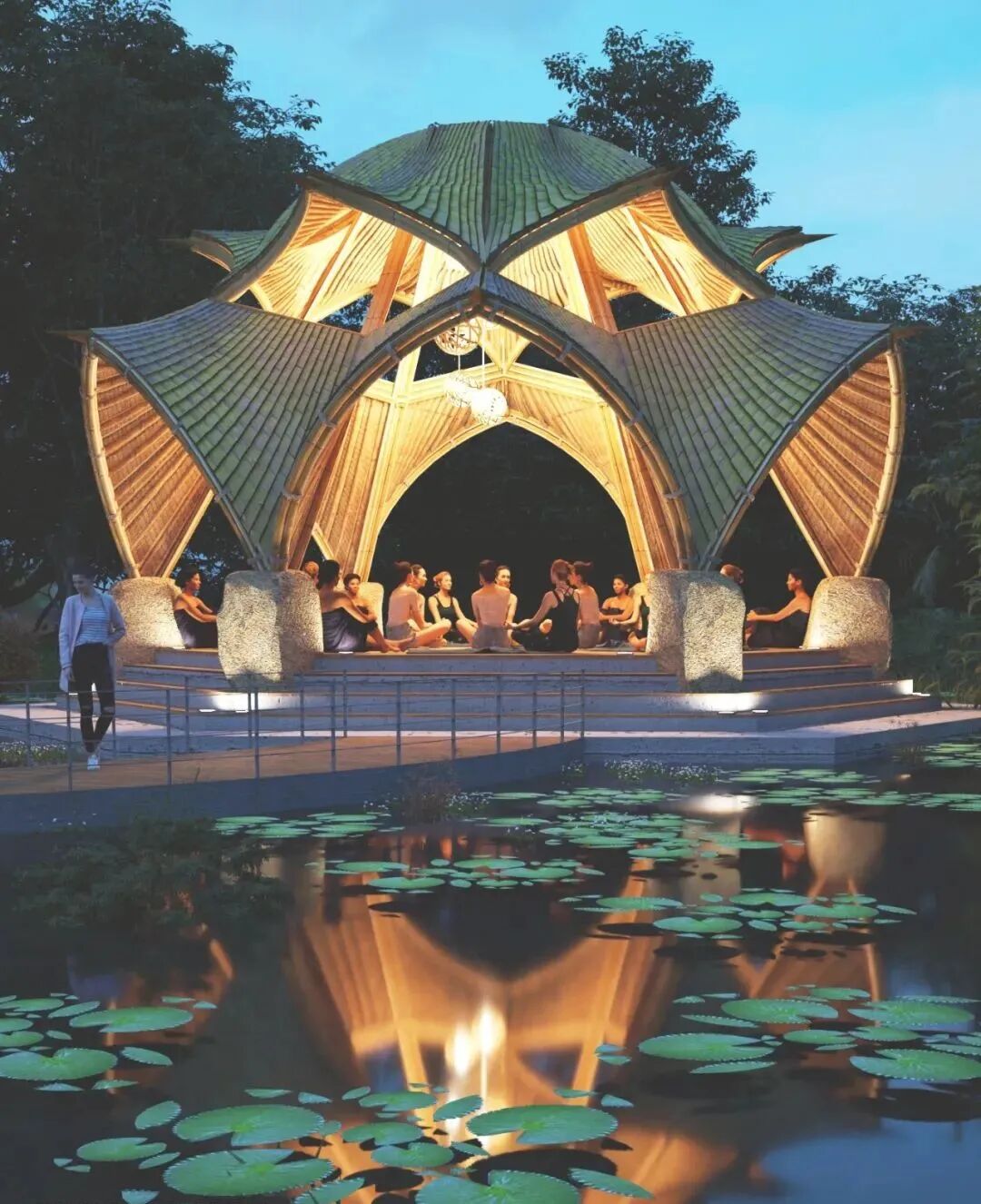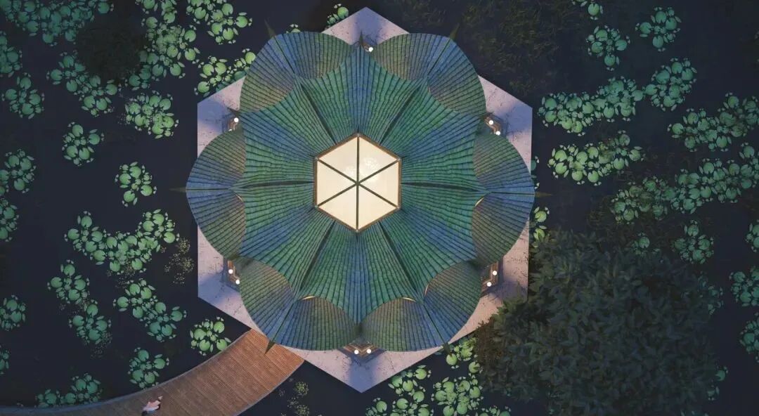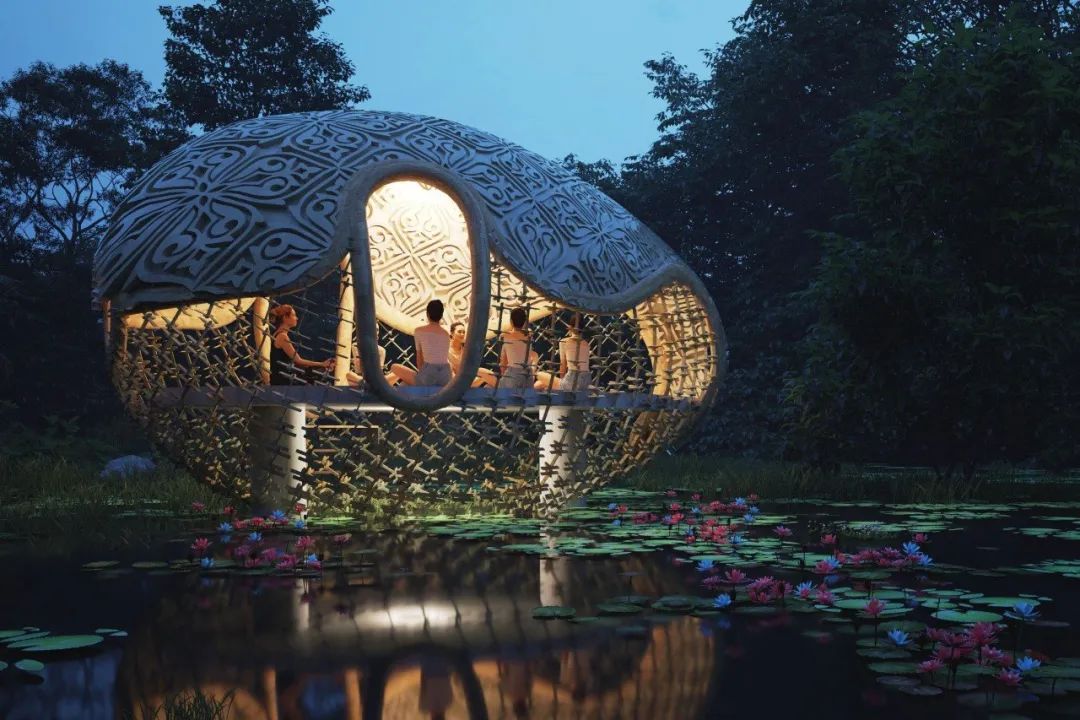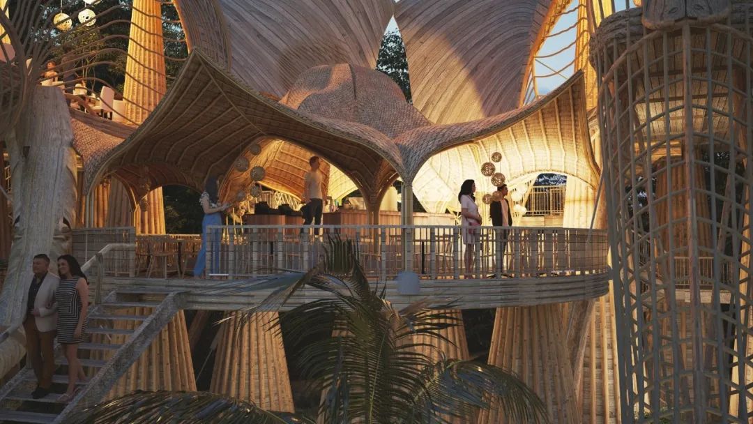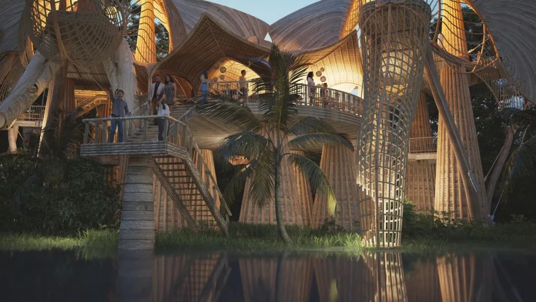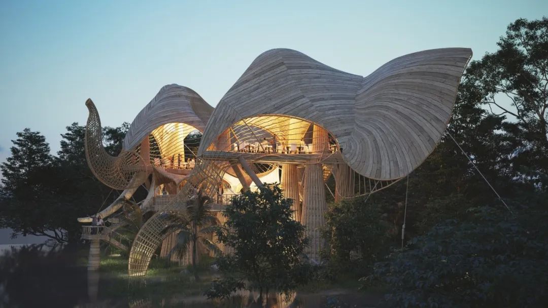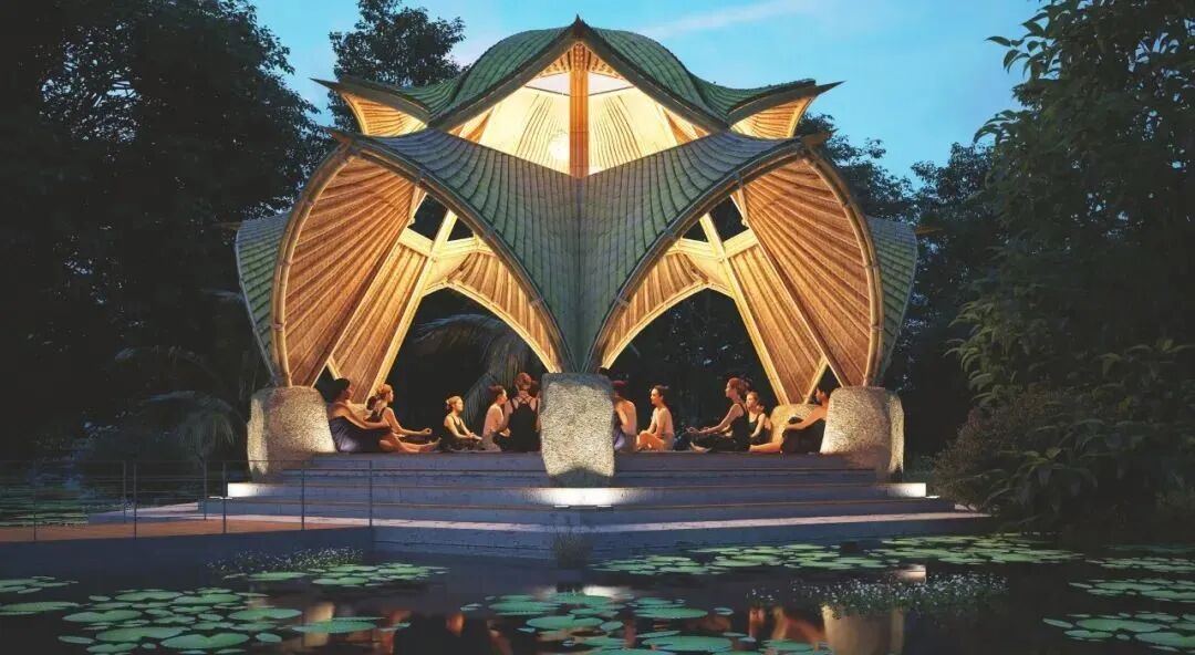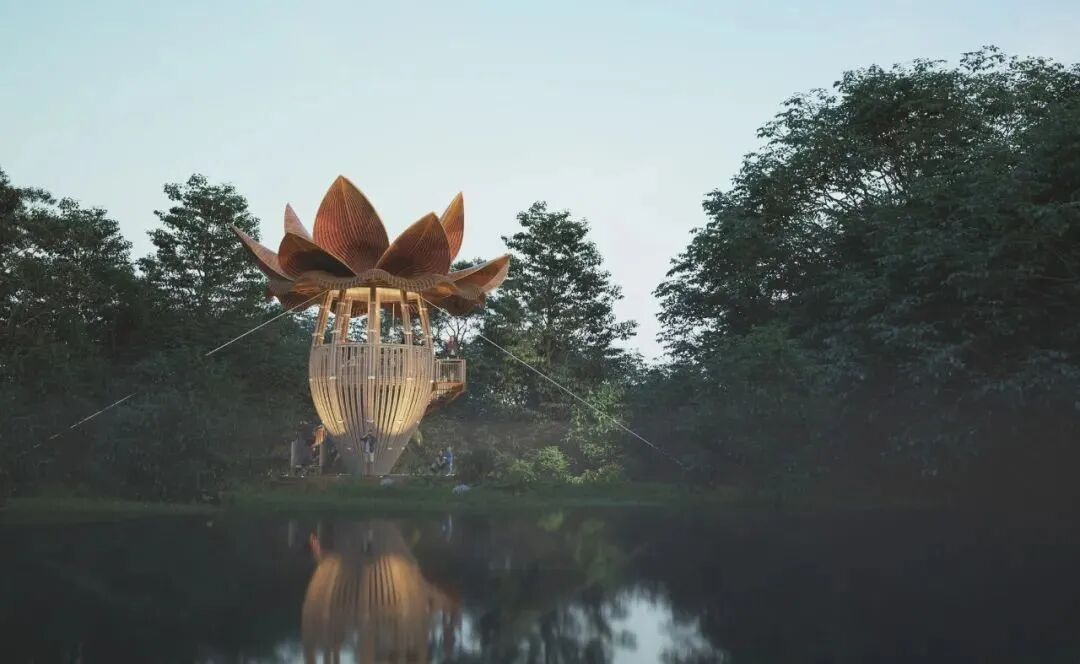 Like most of Lianna’s works, this villa is built with curved bamboo, combined into the shape of an orchid. The outer layer of bamboo is covered with translucent fabric, which makes each bamboo post resemble a vein on a flower petal. Ingenious use of light can change color of “flowers” and bring a unique aesthetic feeling to the building.