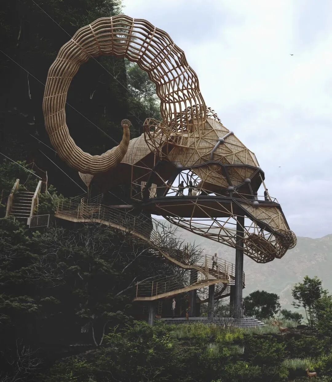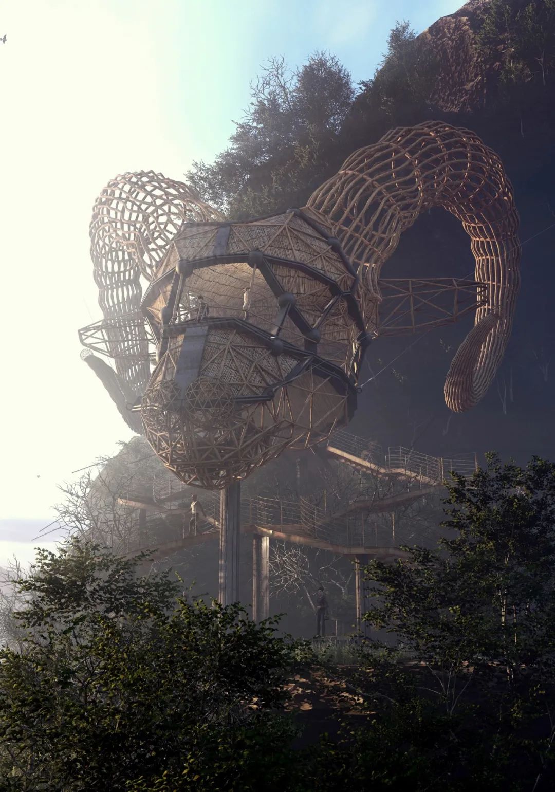 The huge horn made of wood and wicker is not only one with the environment, but also seems sacred and solemn under the vast sky because of its magnificent scale, like a silent ode to the wilderness.