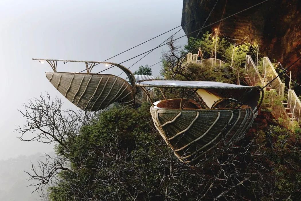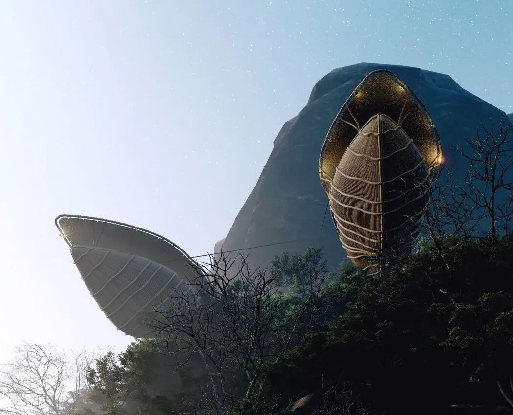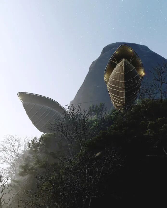 It’s hard to imagine that common and seemingly useless peanut shells can also be design inspiration. The peanut shell villa built by Lyanna hangs from the cliff, showing a broken shape, and the middle part is used as an accommodation and viewing space.
