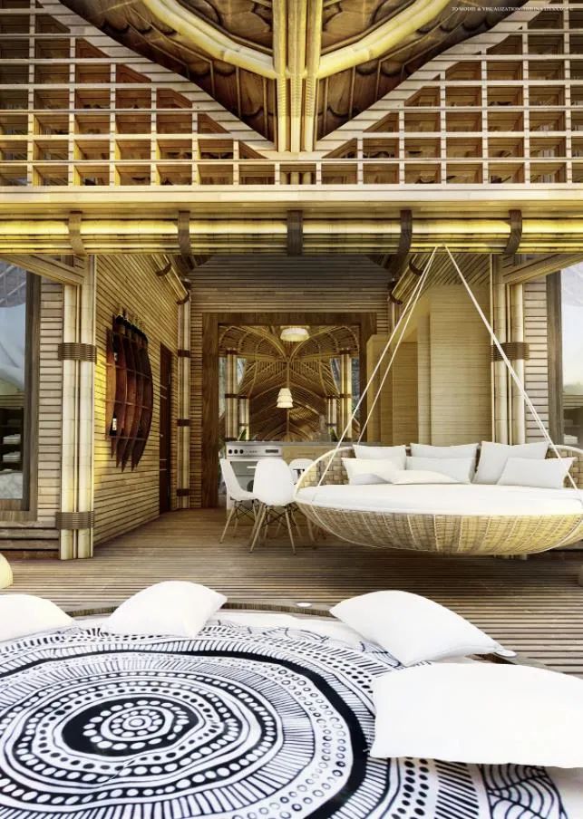 For those who are eager for nature, the spread chest and wings of the “flying bird” provide wide open indoor activities. The villa is divided into two floors, the upper floor is the bedroom, the lower floor is the living area and bathroom, and there is a cantilevered hammock next to it for people to rest.