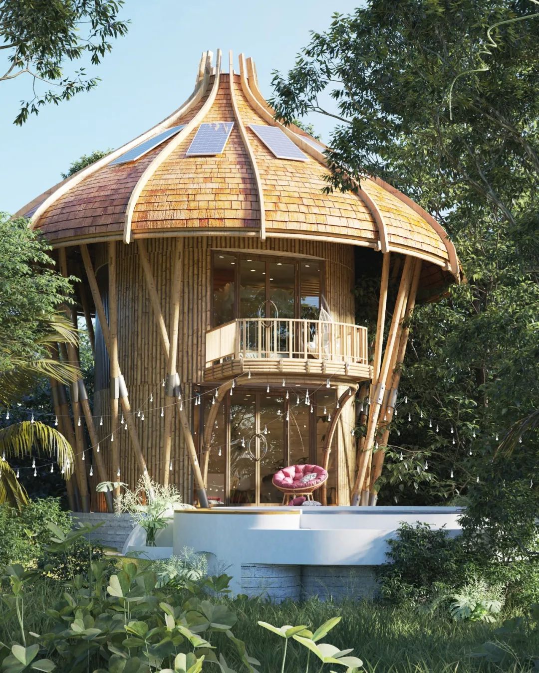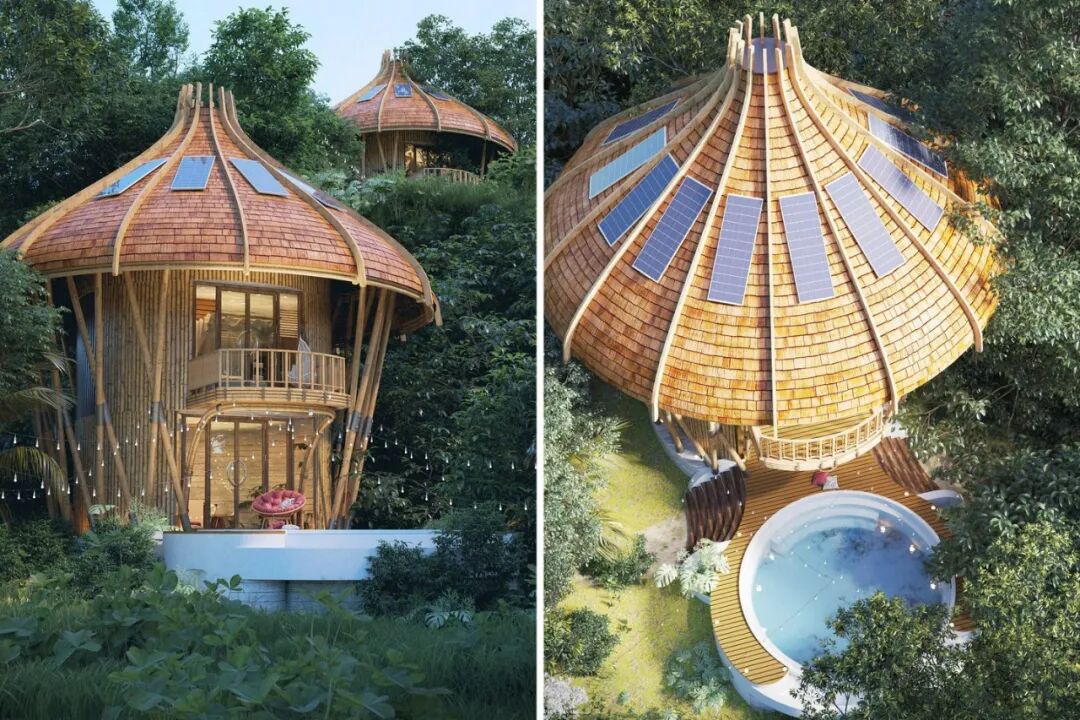 The Mushroom Villa is a duplex holiday home with a comfortable design that contains a living room, terrace, bedroom and oversized balcony. The mushroom-shaped roof is equipped with 14 solar panels, which provide living electricity for the villa, which is environmentally friendly and convenient.