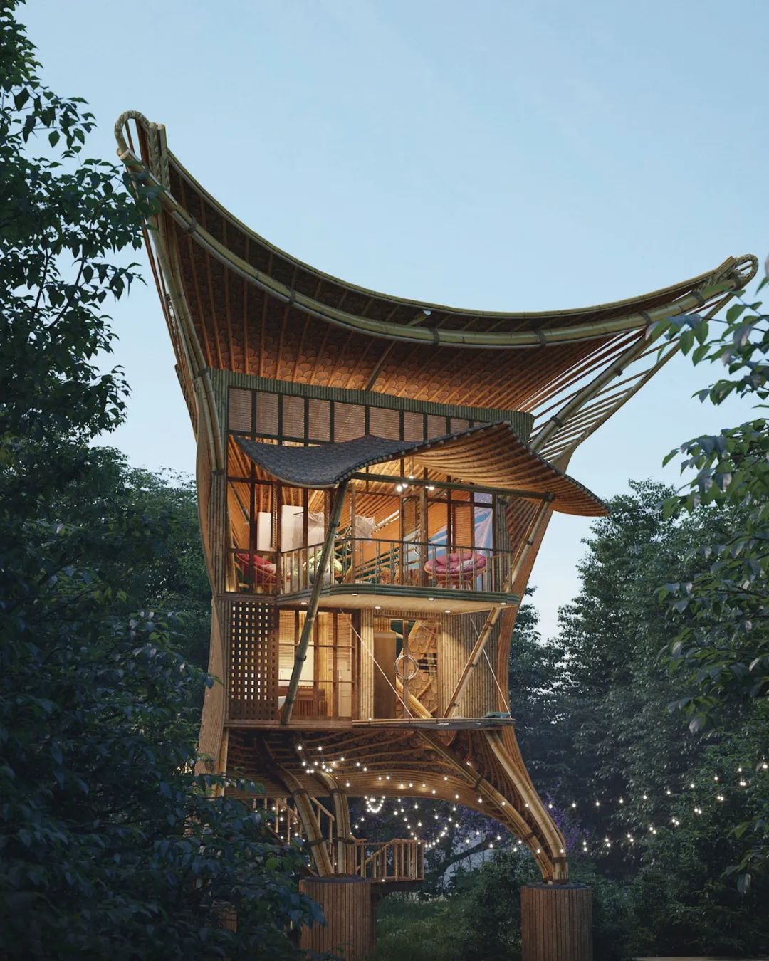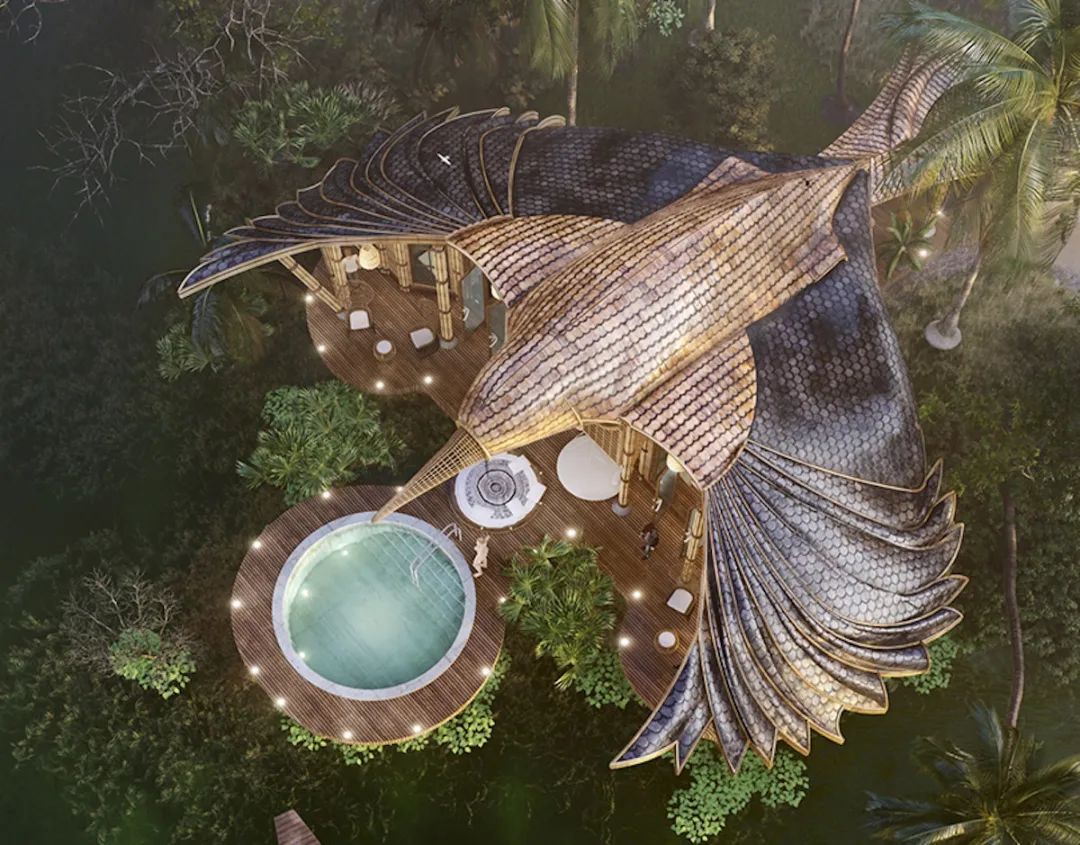 This bamboo-carved villa designed by Lyanna is like a giant bird flying, with an elegant posture, nestled among the mountains and green trees. The natural properties of bamboo and wood make it a growing part of the landscape.