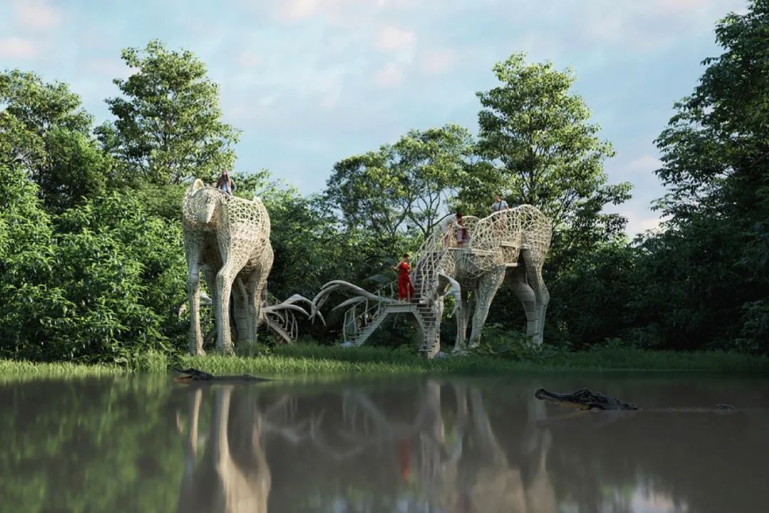 Lyanna designed this giant observation platform in Sri Lanka’s Yala National Park. The platform imitates the graceful posture of deer. On the solid wooden structure, a winding staircase leads to the double-decker platform, which can accommodate more than ten people. There is nothing above the platform, only the boundless blue sky.