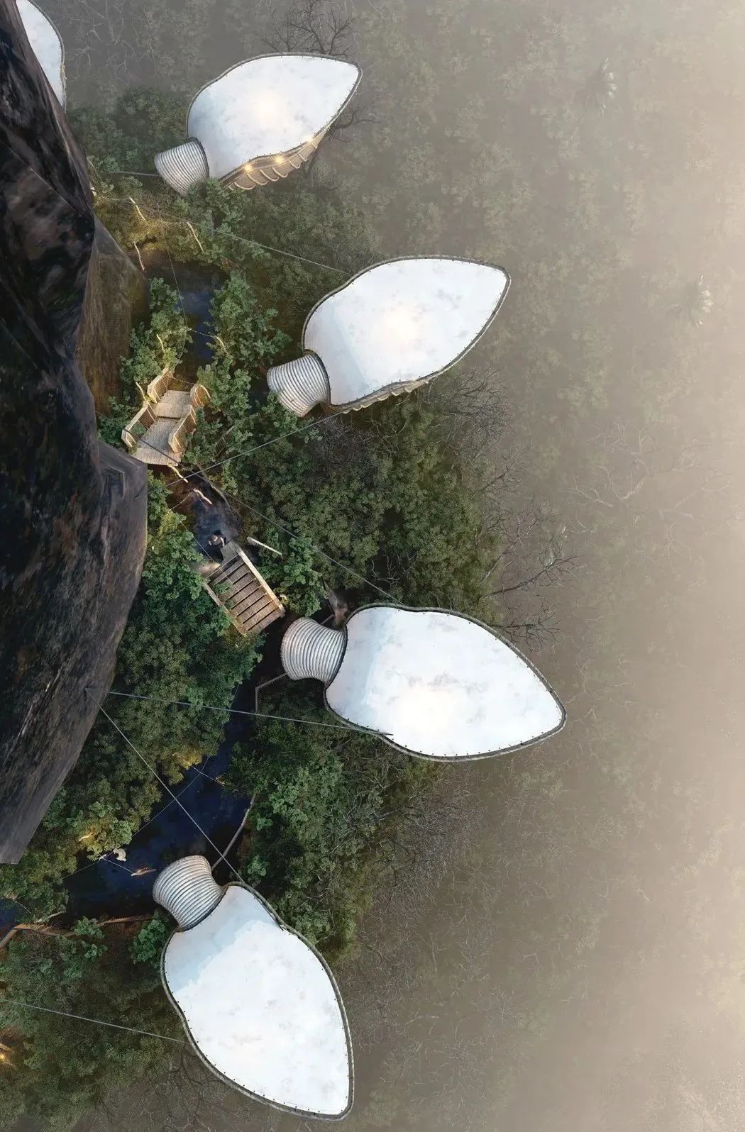 The pod houses designed by Lyanna are in twos and threes, strewn at random, looping back to each other, just like a poem dedicated to the earth, containing abundant hope and beauty, and becoming the best footnote of the land.